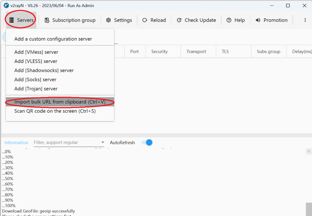 حالا باید آدرس سروری که گرفتید رو اول کپی کنید و بعد طبق عکس زیر روی servers کلیک کنید و بعد import bulk url from clipboard رو بزنید تا سرورتون اضافه بشه به برنامه